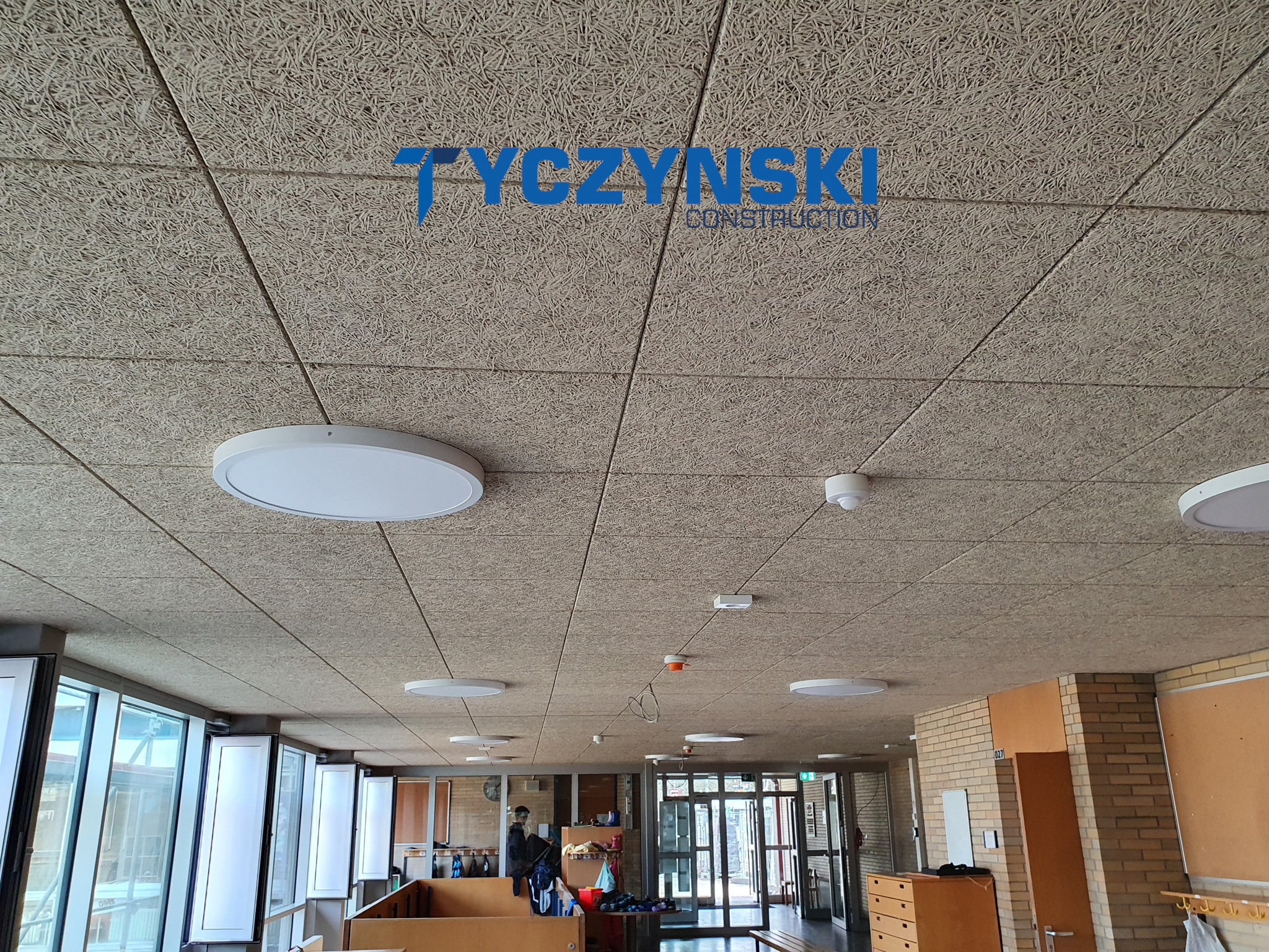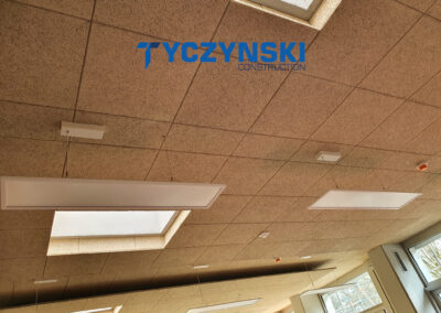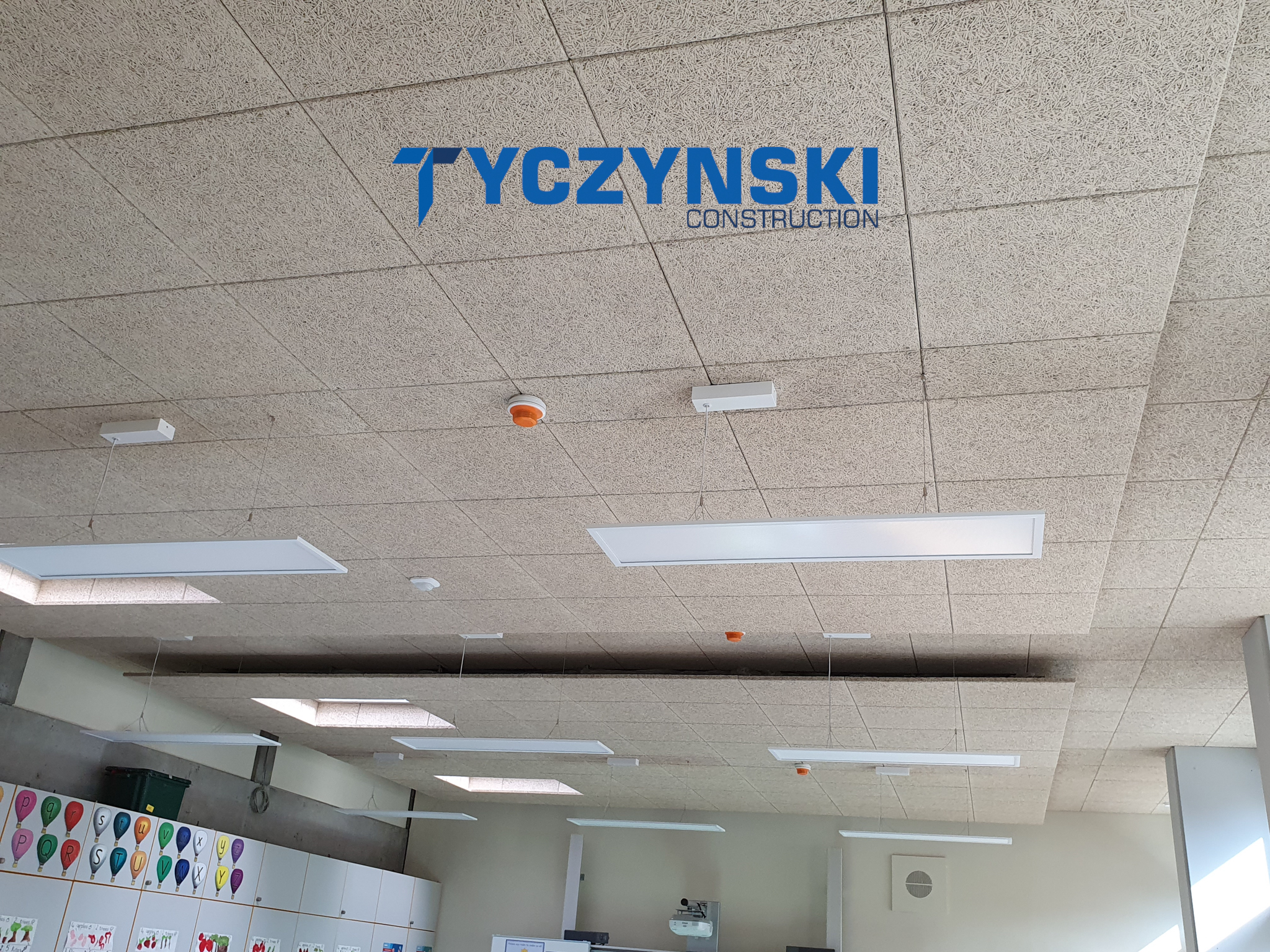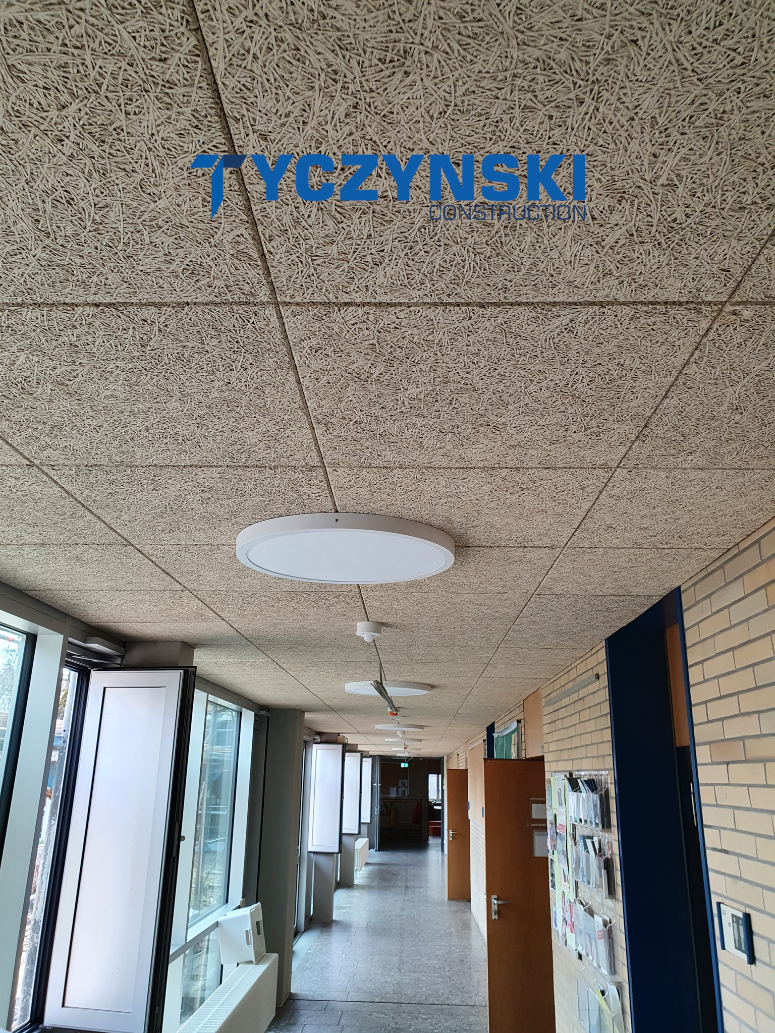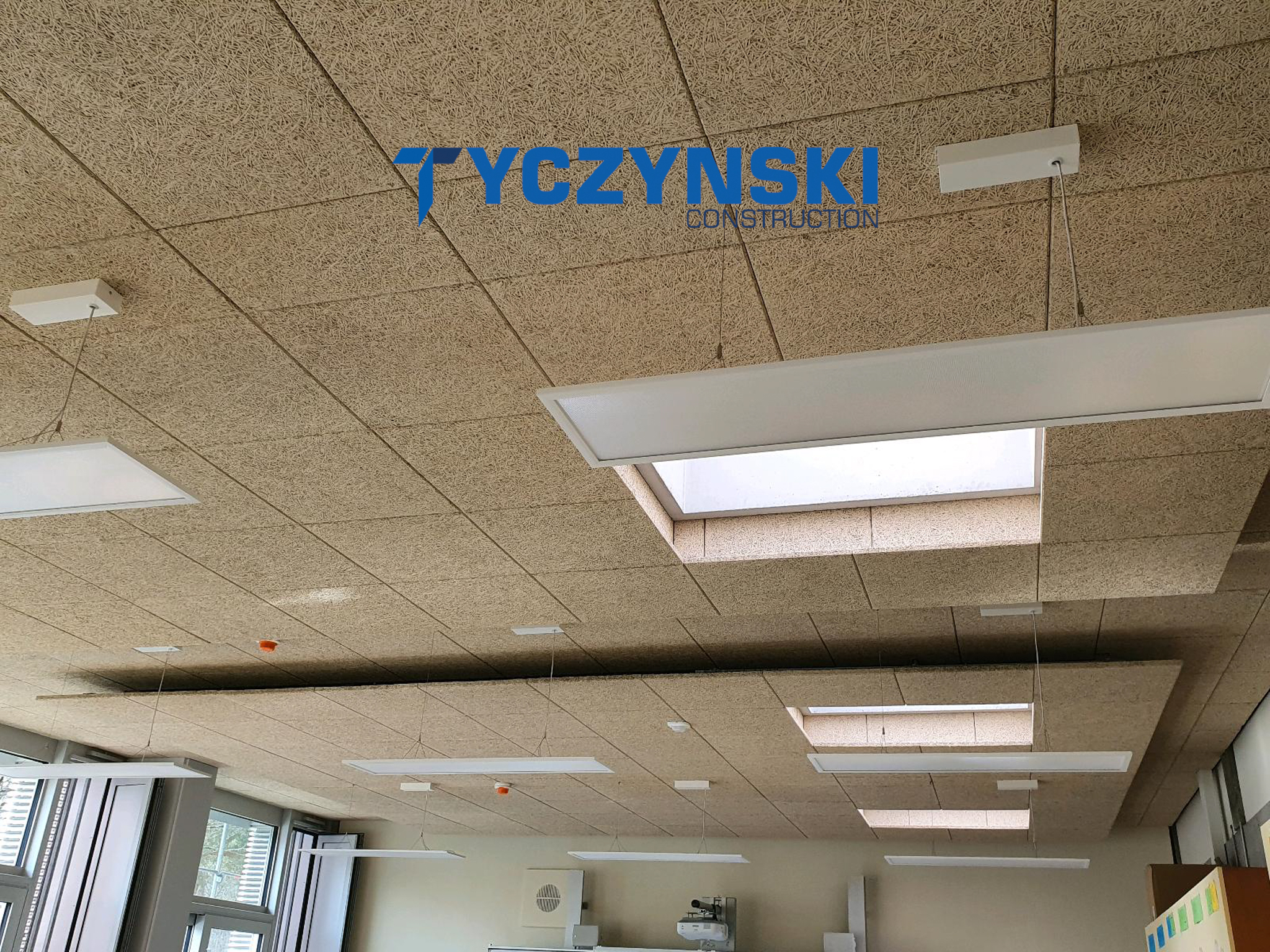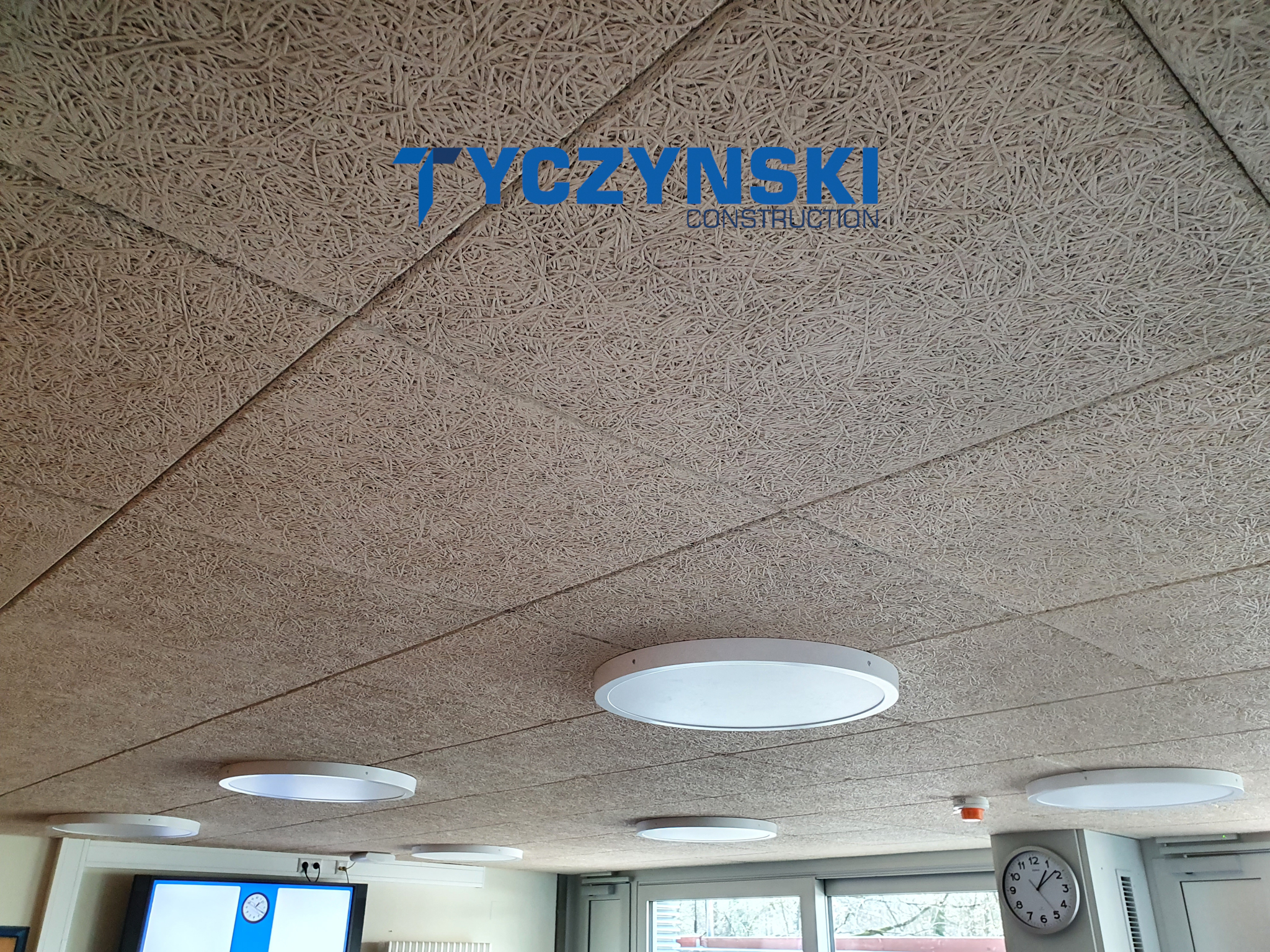 Erster Bauabschnitt in der Europäische Schule ist schon fertig. Wir haben gemacht eine sehr schöne Decke. Haardesign Platte mit Unterkonstruktion und Schalldämmung.